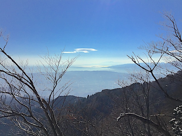 山頂から相模湾方面を望む。右手から延びる岬は真鶴半島。海に向かって鶴が翼を広げたように見える地形からこの名があるとか。標高も1200mを超えるとすでに落葉は終わり、冬支度が始まっていた。