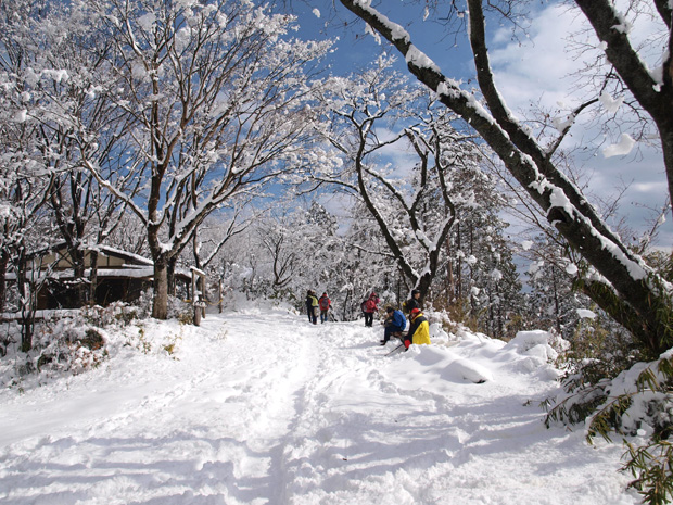 普通に登山道を歩くだけでもキレイだ。写真は高尾山山頂から5分ほど歩いた「もみじ台の茶屋」。普通に高尾山とは思えない景色になっている。ただし、雪が降ってもすぐに元に戻ってしまうので、タイミングが重要だ。