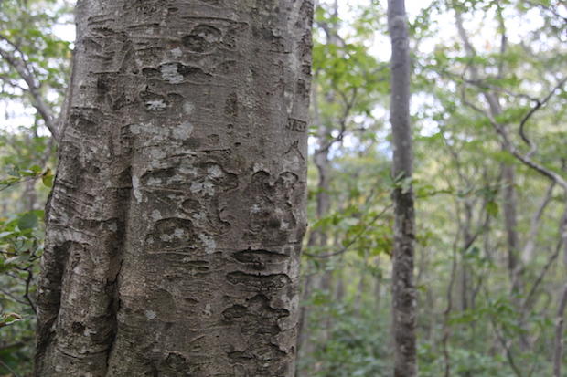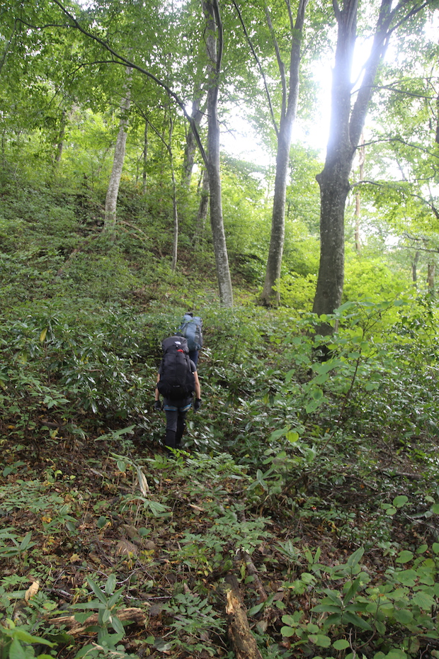 ナンバン越えの尾根道は崩壊していた。傾斜の強い迂回路を登ると、穏やかなブナの森になった。ここで泊まれと森がささやくが、さすがにまだ早く、後ろ髪を引かれながら先を急いだ。