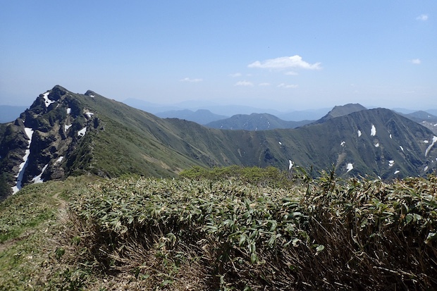 笹薮を漕ぎ、簡単な岩場を登って行くと、一ノ倉尾根に出る。まだ国境稜線までは長いが、尾根に出ると360°の絶景が楽しめるので、足取りも軽くなる。