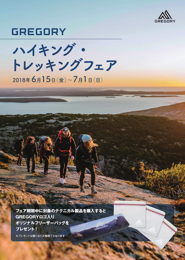 そんな哲学が詰まったグレゴリーのモデルを購入した人に、非売品の限定商品がプレゼントされる「ハイキング・トレッキングフェア」が7月1日まで開催中です。キャンペーン期間中、グレゴリーのバックパックを10,000円(税込)以上お買い上げの人に、ロゴ入りオリジナルフリーザーバッグがプレゼントされます。