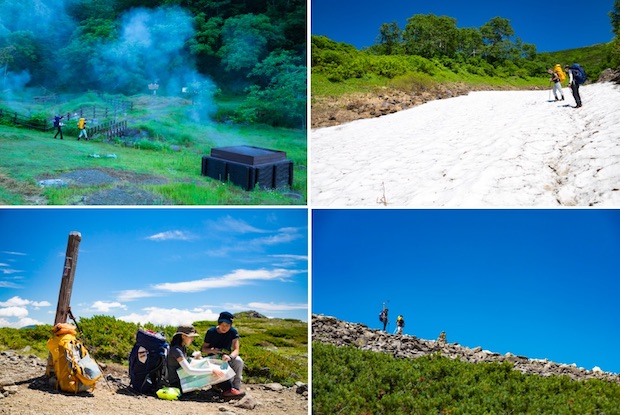 左上)源泉がもうもうたる煙をあげるなか、噴泉塔の脇を通って登山口へ。右上)コマドリ沢出合からは雪渓を登ってゆく。軽アイゼンを用意していたが、この日は使わずにすんだ。左下)前トム平にて休憩。ときおり聞こえるナキウサギの唄に、耳を澄ませながら……。右下)前トム平から先は展望が広がる別天地。ありがたいことに、雲ひとつない晴天に恵まれる。