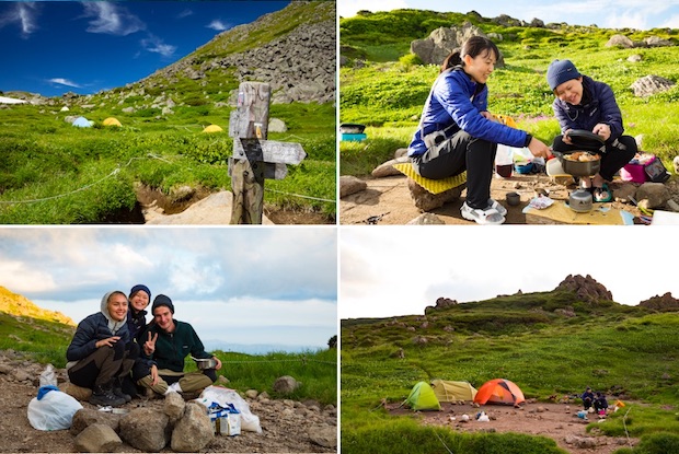 左上)ようやくたどり着いた南沼キャンプ指定地。沢水にあふれる、雲上の別天地。右上)乾物やスパイスだけでなく、地の食材やワインを担ぎ上げる男前なふたり。左下)隣にテントを張った、ベルギー人カップルと意気投合! 右下)静かに日が暮れゆく。北海道の夏は夜も朝も訪れが早い。