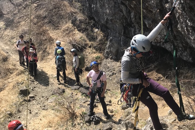 中央フェイスでアブミトレーニング。すぐ横をハイカーが通る。
