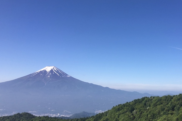 登攀中での1枚。登っていて、ふと後ろを眺めると富士山の絶景が広がる。気持ちのよいロケーション。