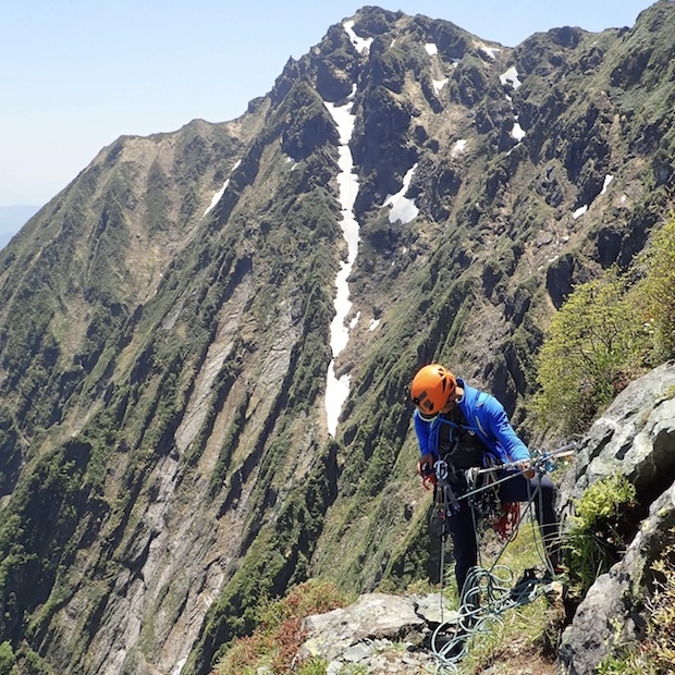 今回紹介するのは、この岩場で1番人気の「中央カンテ」。中央フェイスの左端にあり、4ピッチ(Ⅳ+〜Ⅴ+級)の好ルートだ。難度は最大でⅤ+級となかなか難しい。ちなみに中央カンテのすぐ横には、映画「岳」のために作られた「岳ルート」があり、撮影で主役の小栗 旬が登っている。
