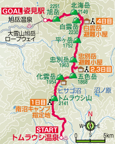 国民宿舎東大雪荘(2時間)温泉コース分岐(1時間10分)カムイ天上(1時間20分)コマドリ沢出合(1時間)前トム平(2時間)南沼キャンプ指定地