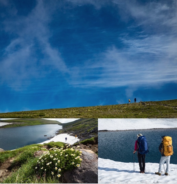 空はもちろん、稜線も広い。雲が流れゆく下を、どこまでも歩いてゆく。左下)万年雪に包まれる北沼とチングルマ。