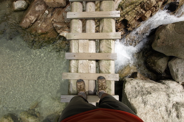 (左上)山頂に関しては、御在所岳よりはるかに癒される国見岳。(左中)裏道では、一部の登山道が崩落していることがあるので注意。(左下)荒々しい河原を歩けば、間もなく藤内小屋だ。(右)五体投地ではない。猛暑で脳みそが半熟にならないように冷やす図。藤内小屋近くの沢にて。