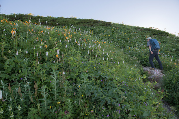イブキトラノオとニッコウキスゲ、ハクサンフウロの合間を、「ごめんよ」とばかりに歩いてゆく。あたりにはやわらかな花の香りが……。