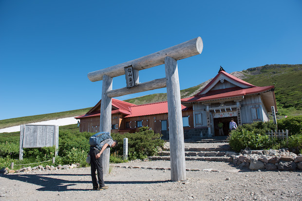 室堂にある白山奥宮祈祷殿にお参り。その向こうが白山山頂。