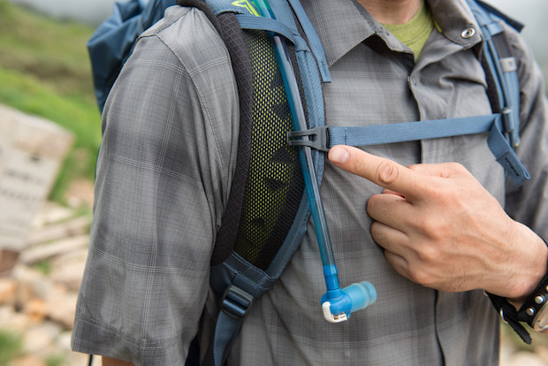 ハイドレーションホースを留めるクリップ。確実に作動し、ストレスがない。