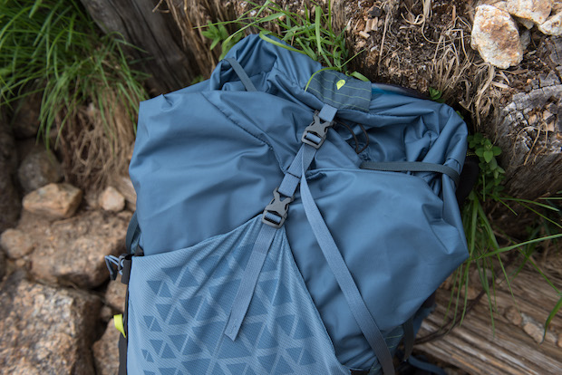 今回の参考のように、道具が少ないときは雨蓋を収納して使用できる。そんなとき、2段になったストラップが荷物をしっかり引き寄せることで、ホールド感を高めて体にフィット、パックが振られることがない。