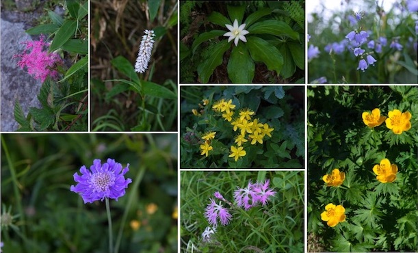 イブキトラノオ、キヌガサソウ、ヨツバシオガマ、ミヤマシャジン、タカネナデシコ、リュウキンカ、ミヤマキンポウゲ、エンレイソウ―――。