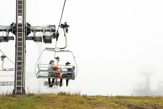 アプローチが楽々なのが、このルートの魅力のひとつ。いままで真っ白なゲレンデしかみたことがなかったので、雪のない時期のリフトに乗っているのが不思議な感じ。