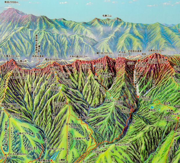 ゴンドラ乗り場にあった、北アルプス・後立山連峰のマップ。