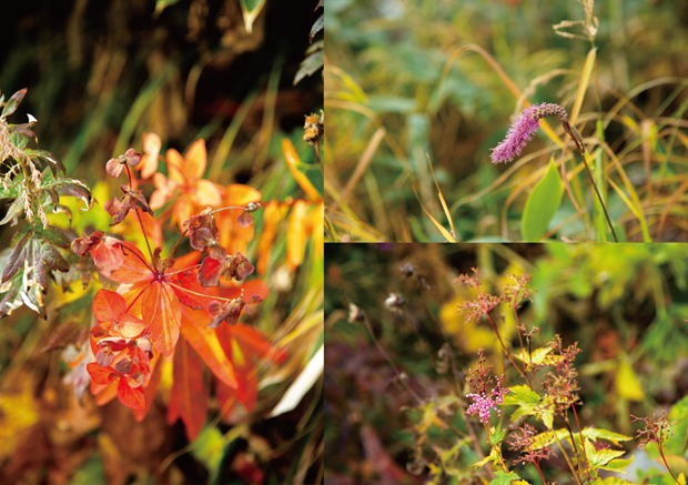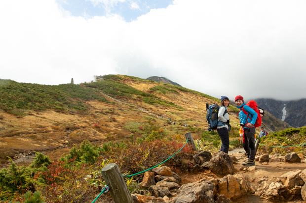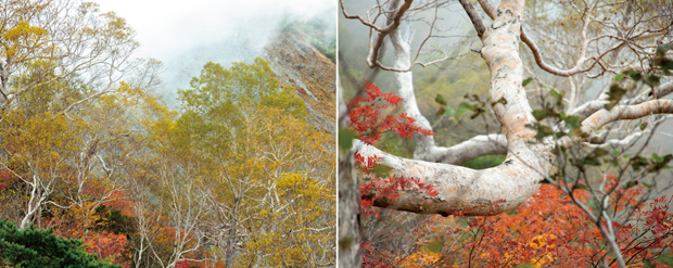 よく整備された登山道を歩き出すと、まわりの景色は、さっそく緑に混じって朱、橙、黄色と紅葉した表情豊かな山の景色が広がっているではありませんか。しかし、霧の白さで、まだ全貌はわかりません。紅葉のシーズンをズバリ当てるのは、じつはけっこうむずかしいもの。今回の登山でも、事前に紅葉の進行状況を2週間ほど前から綿密に調べていたのですが、はやく自分の目で紅葉の具合をたしかめたいというモヤモヤした気持ちのまま、しばらく黙々と歩きました。