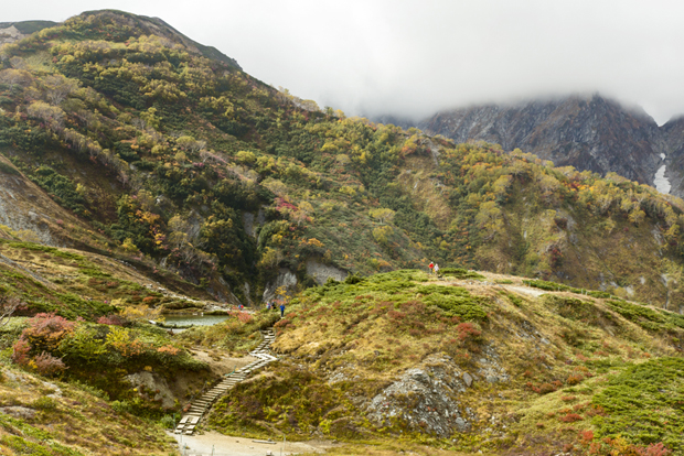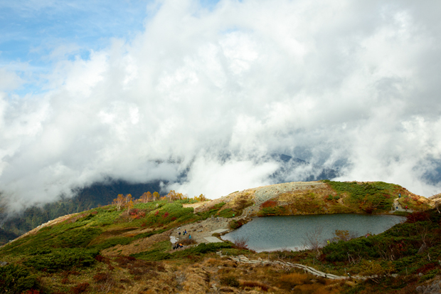 八方池があるのは、標高2,060m。雪解け水や雨水によってできた天然池で、水深は深いところで4.4mもあるといいます。神秘的な池と白馬の山々とのベストマッチな景色は、写真愛好家にも有名なスポット。また、ここまでは比較的、軽装な登山装備でもたどり着けるということもあり、到着したときにはすでに大勢の訪問者で大変賑わっておりました。標高も2,000m代に入り、見え始めた山肌の紅葉は、緑に混じって朱色や黄色が増えて、池とのバランスもすばらしい景色です。ただ、なかなか頂上まで雲が抜けてくれません。少し粘って、軽く昼食をとりながら、雲が抜けるのをみんなで待ってみたのですが、時間はどんどん過ぎていきます。遅めにスタートしたこともあり、八方池越しの白馬三山の紅葉をみるのは諦めて、先を急ぐことにしました。