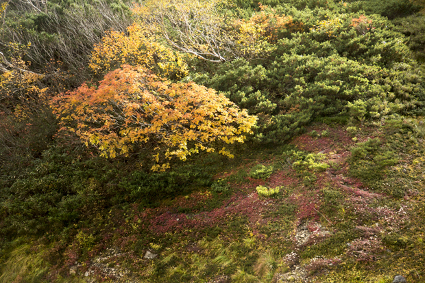 北アルプス、白馬八方尾根の紅葉。登山道のすぐそばには、ナナカマドの紅葉やチングルマの草紅葉が、鮮やかに彩ります。