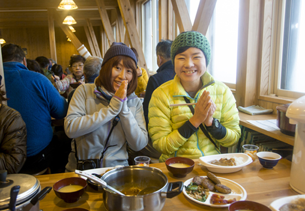 この日は、ちょうど中秋の名月。夕食後に山小屋の外に出てみると、天候はすっかり回復していて、満月が雲海の上に顔を出しています。なんと、小室さんが、お月見だんごを持ってきてくれたので、みんなでいただきました。夕飯後でも、こういったお菓子は別腹なんですね。めまぐるしく変わった気候や天気も、最後にうつくしい中秋の名月を見られたこの日の夜は、明日の快晴を祈って早々に全員就寝したのでした。