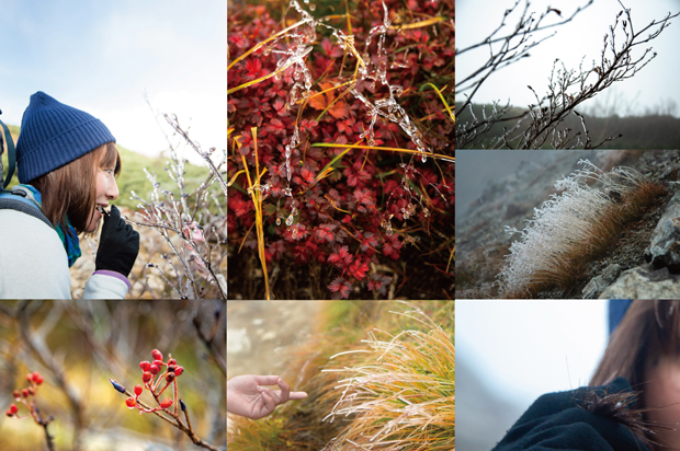 丸山ケルンを過ぎると、秋からいきなり冬の装いに! 足元の草紅葉にも雨氷が冬の芸術をつくりあげていました。(左上)薄い雨氷をまとった木の枝を思わず「パクっ」とくわえてしまった斎藤千春さん。おいしかった? (右下)気がつけば、自分の髪も凍り始めていました。