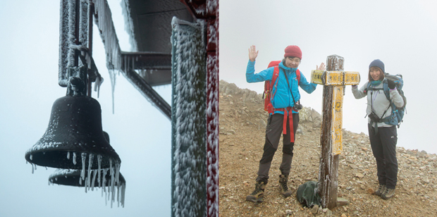 ゴンドラに乗った麓からの標高差は1,000m程度ですが、気温の変化が非常に激しく、秋と冬の両方を感じた山行となりました。初日は霧のなかの行動で雨氷に出会い、翌日の早朝は大きな霜柱が立ち、天気予報も雪マークが出たほどです。秋の登山であっても防寒対策として冬を意識した装備、手袋、ネックウォーマー、ニットキャップ、フリースやインナーダウン、あたたかいベースレイヤーなどの準備が必須となります。