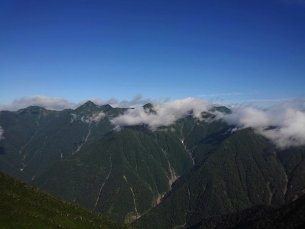 もう、細いハイマツの枝や草に命を預けることはないな、ヒリヒリ、ピリピリする山を終えた。ガスでよくみえないけど歩いてきた稜線を見返す。
