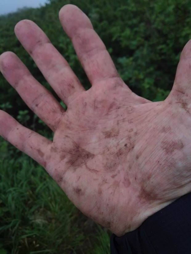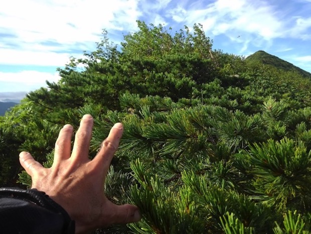 手でかき分け、獣の踏み跡を探しながら歩くが、それすら簡単に踏み外し、笹、ハイマツ、もう一種類の知らない木に妨げられる。休憩したいがそのスペースすらない、キャンプも自分の好きなところにはできない。日高あるある。