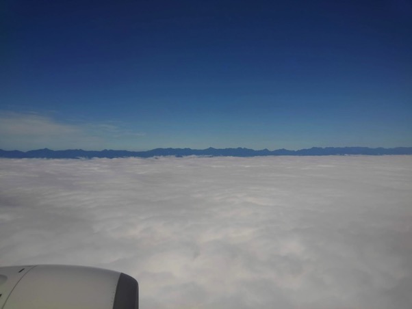 飛行機から見る日高山脈の東側は雲で覆われている。日高の山々が雲を止めている。稜線がくっきりと見える、あそこを歩くのかぁとしばし見とれる。