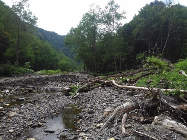 コイカクシュサツナイ登山口の看板を見つけ「よーし、ここからか」と気合を入れ直す。川を遡上していく。日高の山々のほとんどは長い林道歩き、沢を遡上し尾根にとりつき登るパターンが多い。アクセスの大変さとヒグマの恐怖が人の少なさに繋がっているのかもと思う。