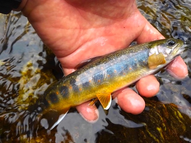 目の前の川で早速竿を振りオショロコマを狙うが大きいのはいない雰囲気。一匹釣ってすぐやめる。魚に触れることのできた喜びだけでOK。