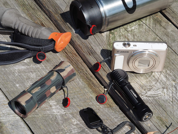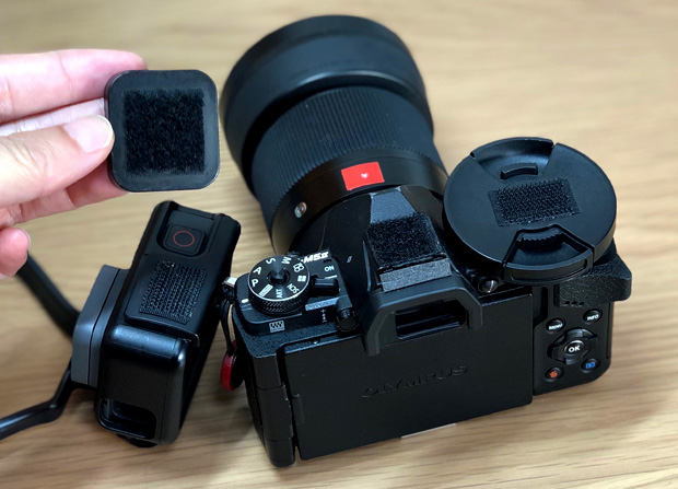 まわりに評判が良いのがこのレンズキャップをベルクロで本体に貼り付けるだけのキャップホルダー。シューカバーとキャップ両方に粘着面付きベロクロを貼るだけ。シューカバーも無くならず、よく紛失するレンズキャップも定位置に固定することができる。応用でレンズのリアキャップとレンズケースにもベルクロを取り付けすばやく取り外せるようにしている(詳細は動画)。GoProはネットで見つけたレンズカバーとフレームケースにベルクロを貼り付けている。GoProは小さすぎて本体に貼る場所がない。