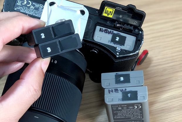 予備電池の管理も大変だ。ボクはバッテリーに番号を振り、123,123と順番に使うようにしている。これで均等に使うことができるし、どれが充電済みかすぐに分かる。使い終わったバッテリーはカメラケースの中に無造作に入れている。