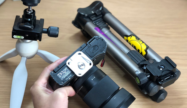 すべての三脚にはアルカスイス互換と呼ばれるクイックシュークランプを取り付けている。少し重くなってしまうが、三脚を取り替える度に面倒だった三脚プレートのねじ回しが無くなり、同じ三脚にミラーレス・スマホ・GoProを簡単に付け替えさせることができるのは便利だ。スマホマウントも少し大きくなってしまうがGoProを取り付け回転させることができるマウントを使っている。