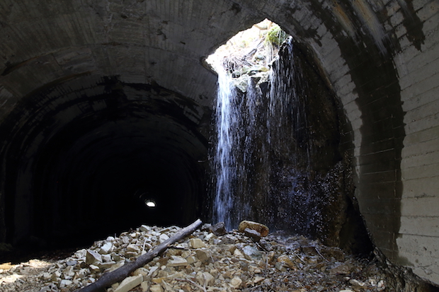 ゆるく登ると、すぐに二ツ小屋のトンネルになる。内部の天井が崩壊して水が流れ出し、水に苛まれた改修当時の困難を彷彿とさせるのである。