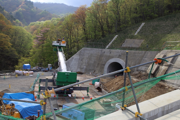 現在工事中の東北中央道。すでに万世大路の直下を貫通しているトンネルは、4代目の万世大路である。