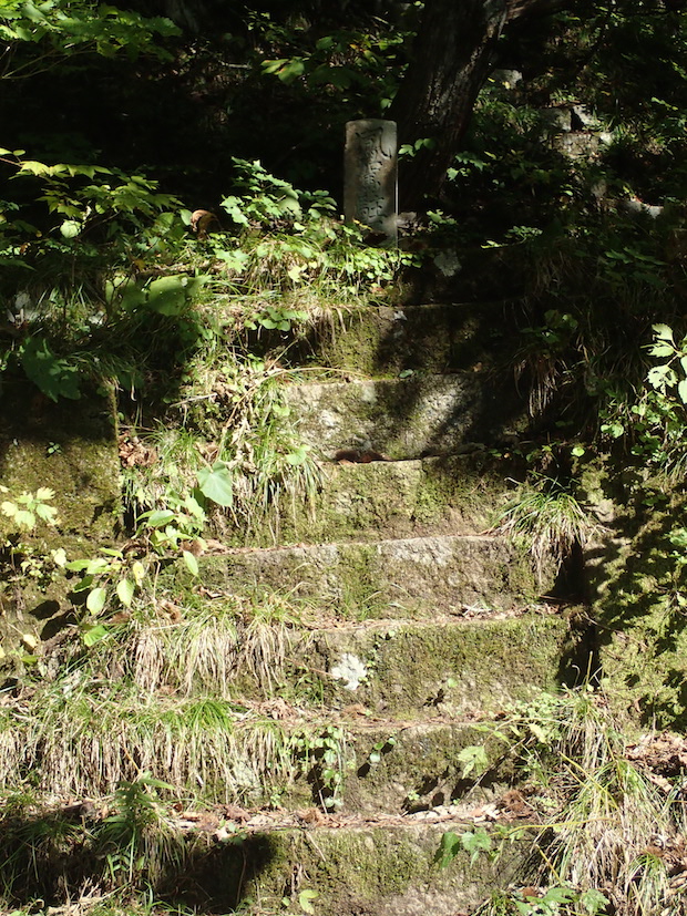 ヘッドランプを灯してトンネルを抜けると、左手の階段の上に、明治天皇が休んだ場所を示す「鳳駕駐蹕の蹟」を見る。