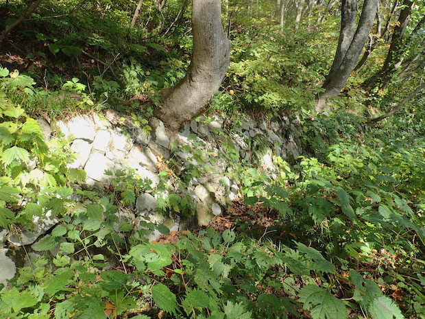 二ツ小屋トンネルの福島側に遺る石垣。すでに木の根に取り込まれようとしていて、野生の復元力の凄さを知らされる。