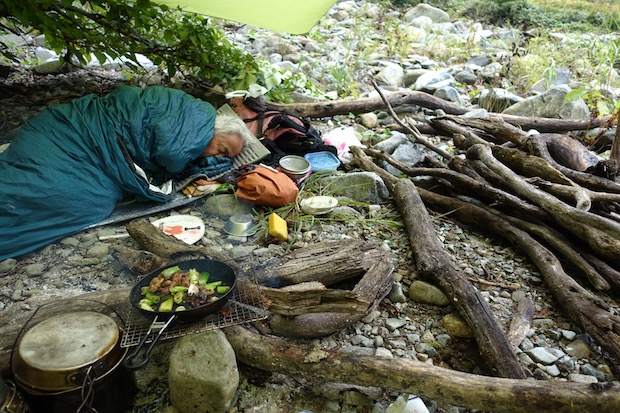 雨の車道を3キロほど歩いた後、登川の川原に適地を見つけてタープを張る。