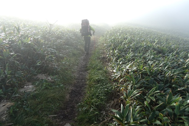 雨は上がっていたが、低い雲が垂れこめた翌朝、寝すぎに気付いて慌てて起きる。その日は蓬ヒュッテまでの行動で、さほどの時間はかかるまいと思っていたからだが、その時点で清水峠への登路を決めていなかったのがミスを招いたことになる。