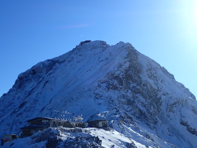 中央アルプスの宝剣岳にあり、年越し営業している山小屋で一番標高が高いのがこの宝剣山荘です。こちらもロープウェイを利用し2,612mまで上がれます。初日の出は、雄大な南アルプスから顔を出す富士山付近より上ってきます。千畳敷カールは雪崩の巣。天気や積雪状況を確認し、最新の注意を払い登ってください。