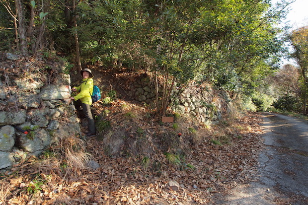 橘集落の登山口は、石垣の間の細道なので注意。石垣に白ペンキで「親指岩↑」と書いてある。
