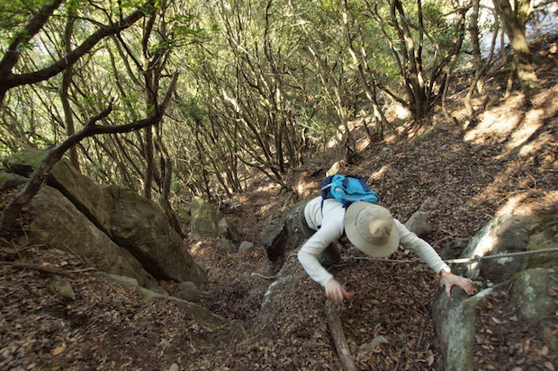 雑木林の登りで、固定ロープのある岩場が数ヶ所。
