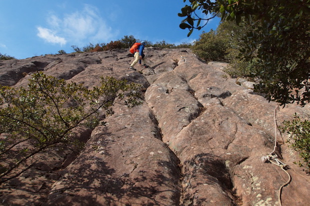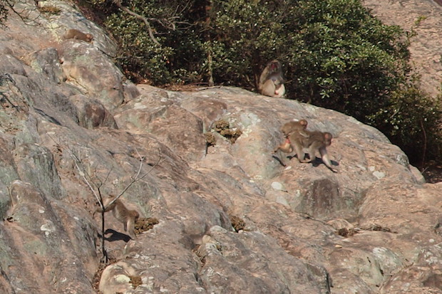 直前までニホンザルが日向ぼっこしていた岩場を登っていく。
