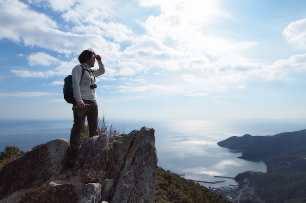千羽ヶ嶽へは、海辺のひなびた集落「橘」からクヌギやコナラ、カシの雑木林を登っていきます。岩場や滑りやすい急登があるものの、固定ロープが設置されているのでむずかしくありません。途中、ニホンザルの群れに遭遇したりしながら、千羽ヶ嶽登山でいちばんの展望地「拇指平」へ。広がる海とそびえる岩壁がひとつの絵になるという、登山者限定の瀬戸内風景を楽しめます。