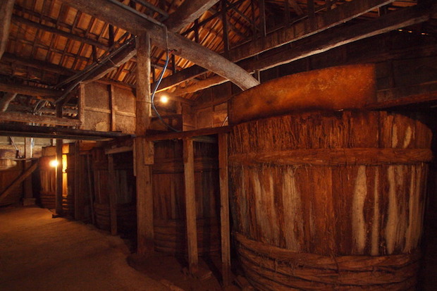 さて、千羽ヶ嶽を越え、山道から林道、そして安田集落へと下ると、そこは醤(ひしお)の郷。小豆島の醤油づくりは江戸時代初期からの歴史があり、現在は22軒の蔵元が残っています。千羽ヶ嶽の下山ルートにある「ヤマロク醤油」は創業約150年。ここの、明治初期につくられた木造の蔵には巨大な杉樽が並び、そのなかで2年または4年かけて醤油が醸造されています。柱や梁や土壁、杉樽の表面はぼろぼろに見えるけど、それは付着した菌の集合体。そもそも醤油というものは、大豆と小麦、麹、塩、その地に常在する菌、そして自然現象(風と温度と湿度)の産物。この古めかしい蔵は、醤油づくりの原点を教えてくれる空間なのです。