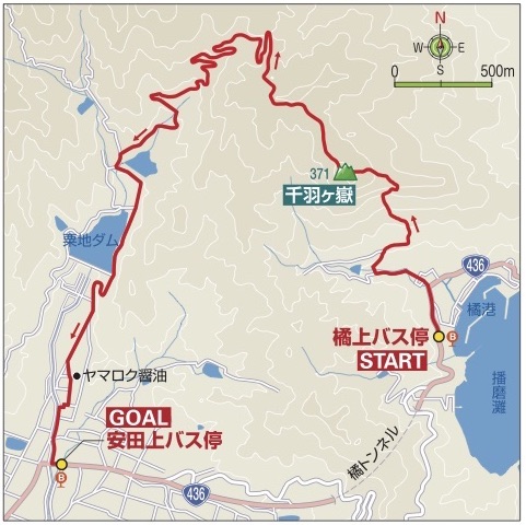 〈歩行計=2時間50分〉橘上バス停(10分)登山口(45分)拇指平(25分)千羽ヶ嶽(30分)林道(1時間)安田上バス停