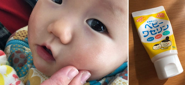 赤ちゃんにとって冬山における敵は寒さだけではなく、乾燥も深刻な問題である。赤ちゃんの肌は大人の肌よりずっと乾燥しやすいのだ。1座目の高尾山では、なにも対策をしなかったため、娘のむき出しのほっぺたは、たった3時間の登山で、真っ赤になってカサカサにひからびてしまっていた。乳幼児用保湿クリームは、冬山を快適にすごしてもらうために必須アイテムである。わが家では、ベビーワセリンを愛用している。サイズが小さく、かなり固めのジェル状なので、厚めにほっぺたに塗っておけば、お肌をしっかり乾燥からガードしてくれる。“厚め” の目安は、ティッシュがくっついて落ちないくらいベッタリがいいだろう。