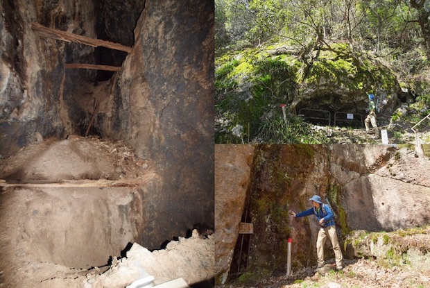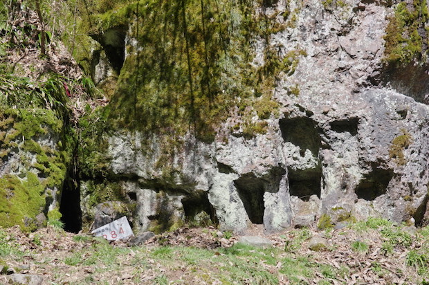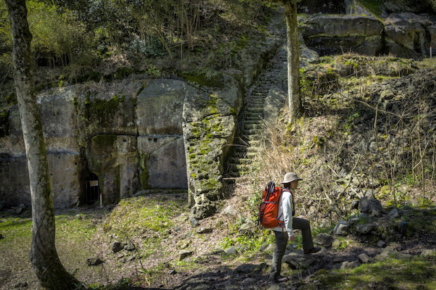 仙ノ山のトレイルにある、古代遺跡のような釜屋間歩(かまやまぶ)。間歩とは坑道のこと。人々は岩を削り、穴を穿ち、地中に富を求めた。