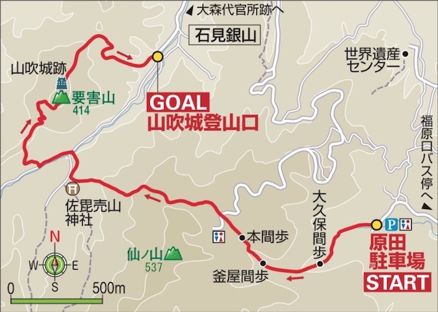 余裕のある低山歩きなので、銀山の史跡をじっくりと見学しながら歩いてほしい。山中の間歩はどれも見学不可だが、龍源寺間歩は一般公開(大人410円、冬季9:00~16:00、1月1日休)。原田駐車場へは、石見交通バスの福原口停留所下車、徒歩15分(世界遺産センター経由で大森代官所跡~福原口間の路線バスあり)。